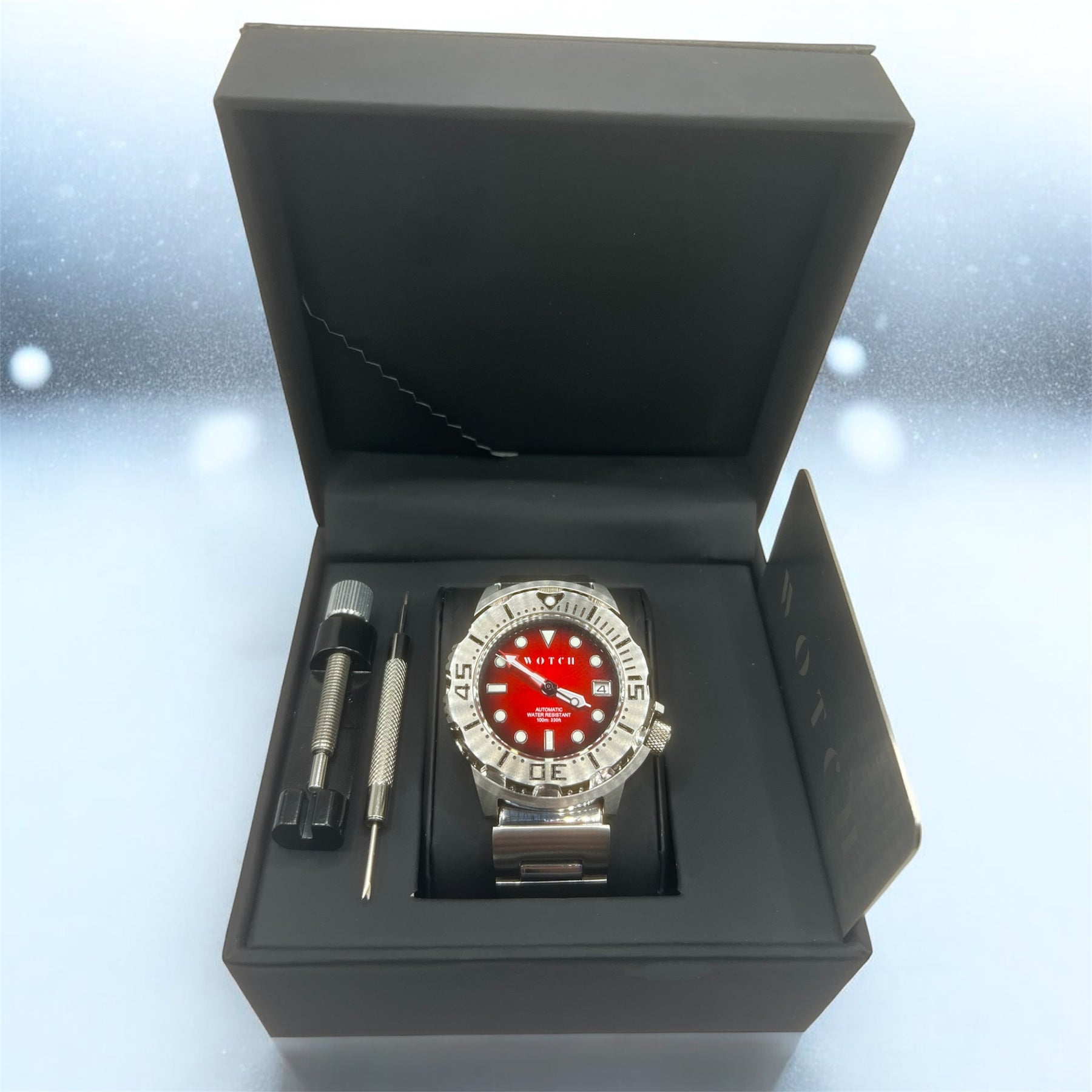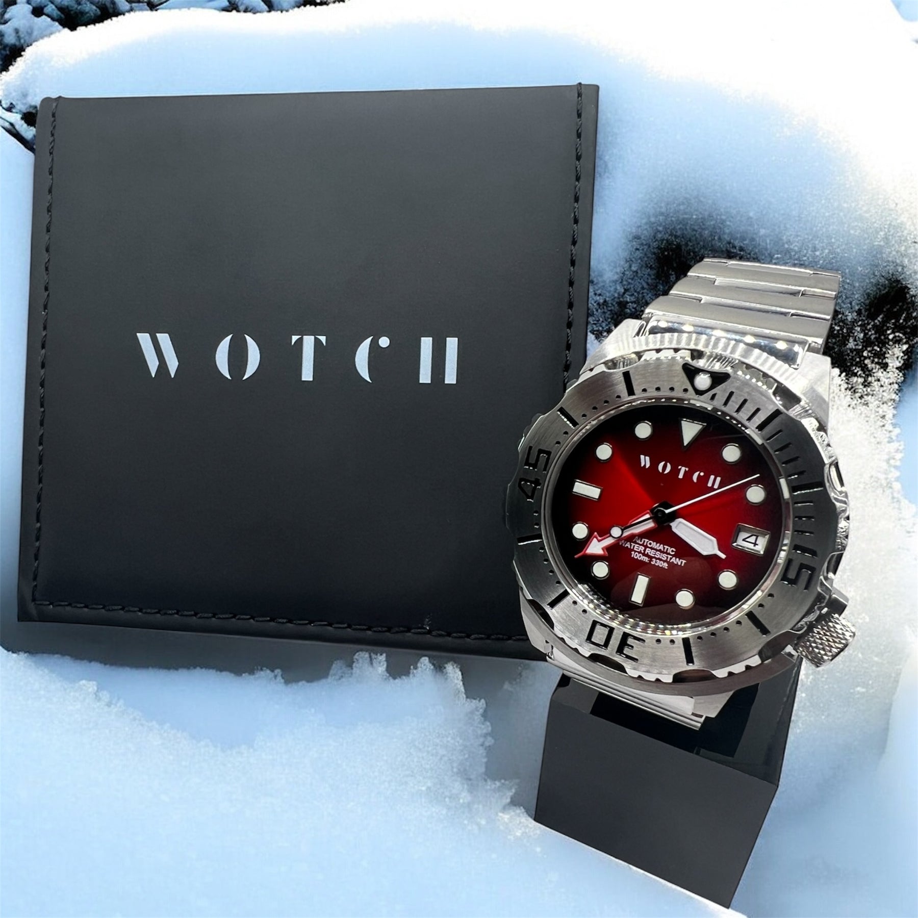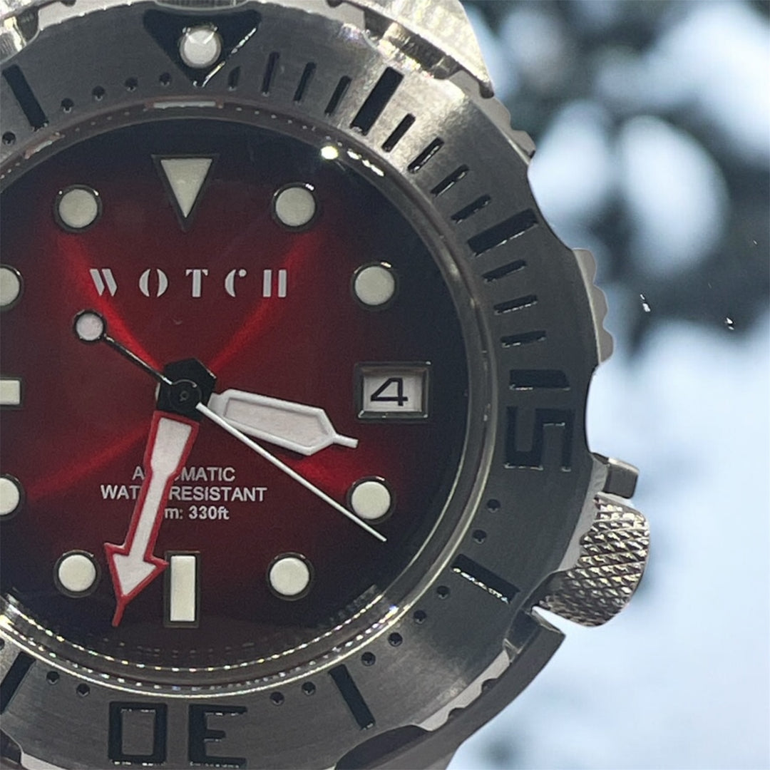 Its rich red dial with luminous hands reflects festive warmth and precision — striking against polished stainless steel.