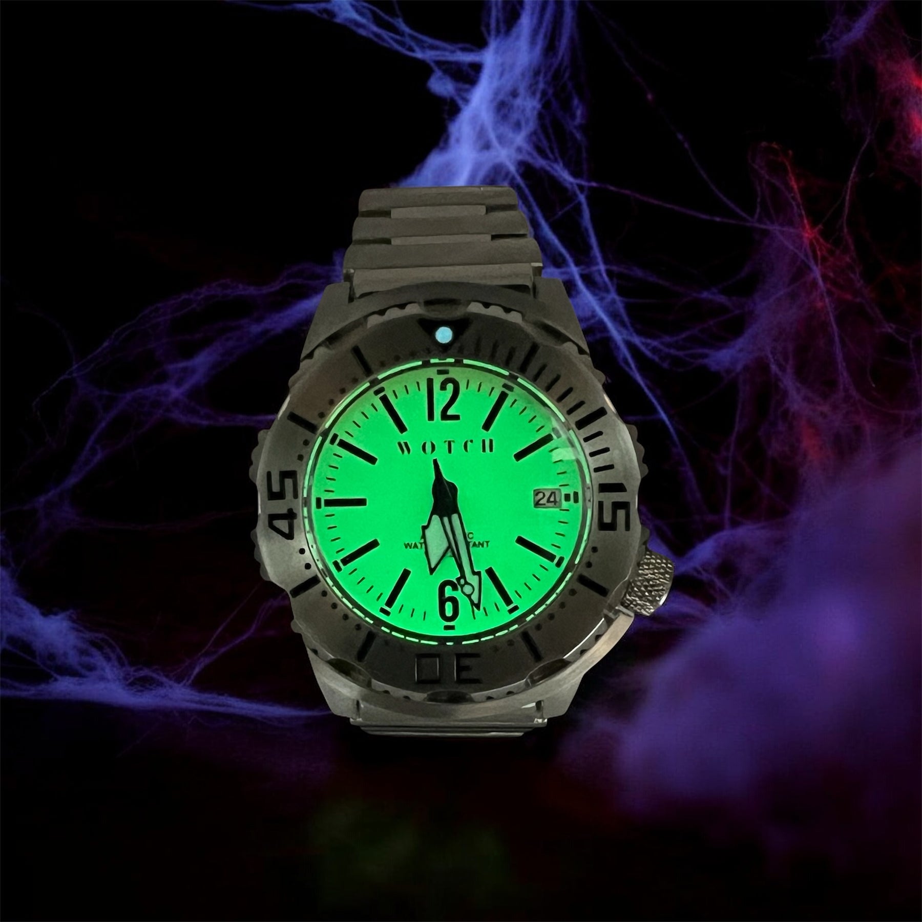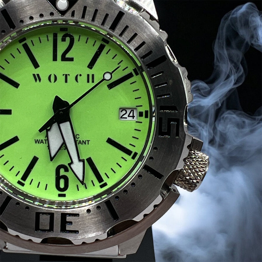 Featuring a deep green dial with luminous indices that glow through the night, encased in brushed stainless steel with a matching bracelet.